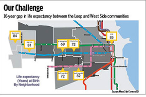 In one of those neighborhoods, West Garfield Park, the life expectancy of 69 years at birth is 16 years below that of residents in affluent neighborhoods on the lakefront just 2 miles to the east. The average life expectancy at birth for the city of Chicago as a whole is 77.3 years.