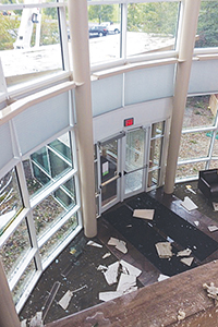 Much of the damage at the behavioral health center and the headquarters building was to glass parts of the buildings and to areas exposed by blown-out windows, but the headquarters also lost its roof. In addition, a glass walkway that connects the heart and behavioral hospitals was destroyed.