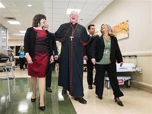 The chief executive of Bon Secours Charity Health System Dr. Mary Leahy, left, said a visit on Sept. 22 from New York Cardinal Timothy Dolan had special meaning for patients and staff at Good Samaritan Regional Medical Center in Suffern, N.Y. His time and prayers with patients, the staff and the public allowed an opportunity to celebrate the work of the health care ministry. Here, they tour the medical center’s emergency department with, right, nurse manager Ana Restrepo.