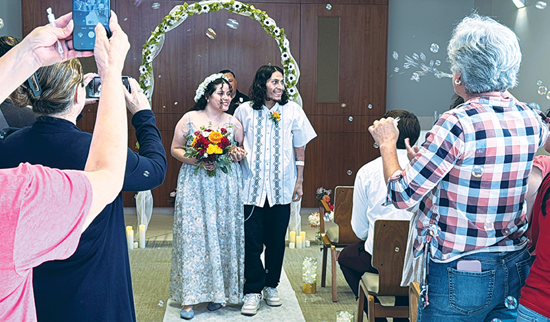 About 70 well-wishers, including family and hospital staff, join Tomás Hernández and Kassandra Salcedo, to celebrate their marriage Oct. 9 in the chapel at Dignity Health French Hospital Medical Center in San Luis Obispo, California.