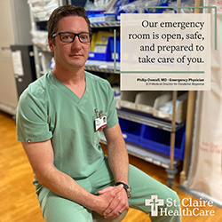 St. Claire screens patients for COVID-19 symptoms including fever before they enter the ER waiting room; once inside, patients are screened again at registration. The ER waiting room has been partitioned off into separate areas for those with and without COVID-19 symptoms. This is to protect patients from contagion, especially those at high risk for coronavirus complications such as the elderly. Staff adhere to rigorous routines for hand washing and the use of personal protective equipment, he said.