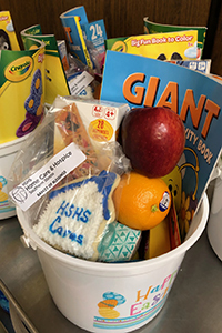 The baskets contain games, puzzles, coloring books, candy, snacks and fresh fruit; along with essentials like soap, toothbrushes, toothpaste and hygiene items.