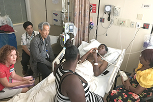 Palliative care team members discuss ways to help Marcus Bell, a patient with Providence Little Company of Mary Medical Center, to better manage his pain. From left, nurse Marianne Ayala, Dr. Yuichi Yanami and Dr. Glen Komatsu are palliative care experts connected with Providence St. Joseph Health. Also taking part in the visit are Marcus Bell's fiance Brilliant Johnson and his grandmother Vera Bell, who is at far right.