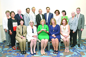 Representatives of Providence St. Joseph Health organizations and other champions of palliative care gather at the Circle of Life Award ceremony in San Diego. Seated from left are Jennifer Kozakowski, executive director, Providence Institute for Human Caring; Yvonne Corbeil, director of program development and education, Providence Institute for Human Caring; Mary Kingston, chief executive, Providence Little Company of Mary Medical Center Torrance; Terri Warren, vice president, hospice and palliative care, Providence Senior and Community Services; and Marianne Ayala, manager of palliative care for Providence Little Company of Mary Medical Center Torrance. Standing from left are Tina Picchi, past executive director of the Supportive Care Coalition; Salve Bautista, nurse practitioner, TrinityCare Hospice; Michael Rodgers, CHA senior vice president of advocacy and public policy; Dr. Matthew Gonzales, associate medical director, Providence Institute for Human Caring; Dr. Glen Komatsu, chief medical officer, TrinityCare Hospice and Providence Southern California regional palliative care; Dr. Ira Byock, founder and chief medical officer, Providence Institute for Human Caring; Dr. Colin Scibetta, associate medical director, Providence Institute for Human Caring; Nusha Safabakhsh, director, quality and measurement, Providence Institute for Human Caring; Anne O'Halloran, Komatsu's administrative assistant; Dr. Melinda Estes, a member of the American Hospital Association board of trustees and president and chief executive of Saint Luke's Health System, Kansas City, Mo.; and Russell Kieffer, director of palliative care, TrinityCare Hospice.
