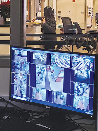 A monitor at a security station shows live feeds from security cameras mounted around the campus of Mercy Hospital St. Louis.