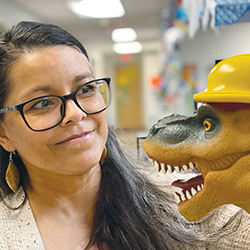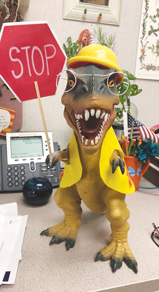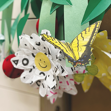 Mobiles made of crumbled tissue paper and vaccine vial caps that resemble vivid sea creatures dangle from the ceiling. Cutouts of themed letters of the alphabet — "B" for bee, "C" for caterpillar, "F" for fox — stream in a colorful array across a wall of cabinets. A small plastic dinosaur stands at the ready in a bright yellow cap and vest for crossing guard duty.