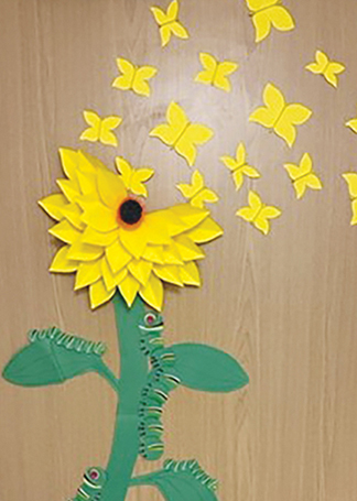 Serna freshens up her designs often, reflecting holidays and changes of season. Some of her past indoor wonderlands have included paper clouds polka-dotted with colorful leftover "COVID-19 vaccinated" stickers; lantern-like hangings made from upcycled plastic bottles; and delicate origami butterflies, some of them alighting on blossoms cut from the soft wrappers that once covered eco-friendly bamboo bath tissue. The dinosaur is a regular and popular prop, with a wardrobe Serna coordinates to match the theme of the décor.