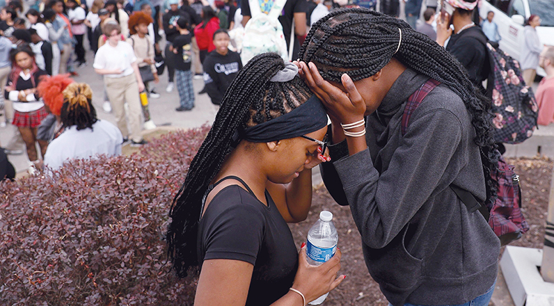 Students gather in a parking lot near St. Louis' Central Visual and Performing Arts High School after a shooting there last fall. The Archdiocese of St. Louis convened a firearms summit this summer focused on how to reverse the tide of gun violence. Health care workers were among those who spoke out. Photo by David Carson/St. Louis Post-Dispatch via AP