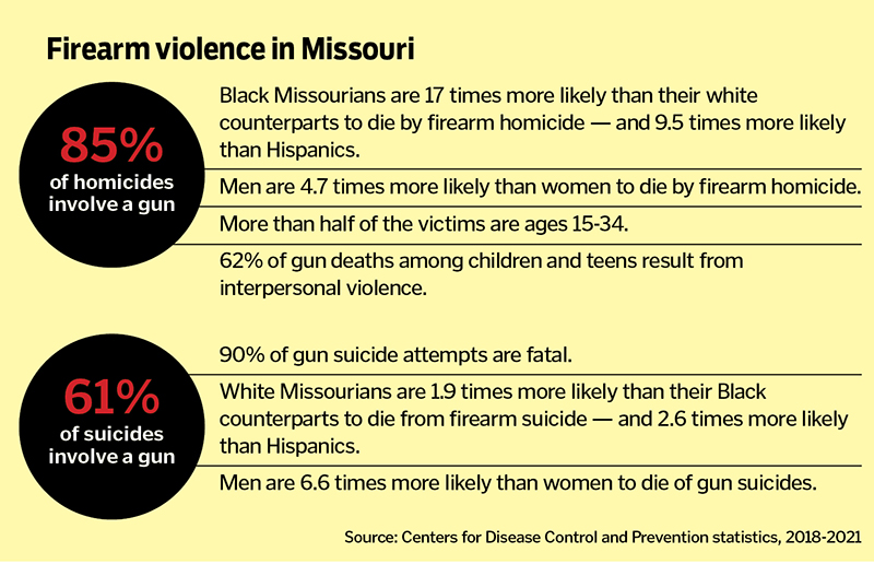 Most of the gun violence victims in Missouri — 85% — are male, with Black Missourians 17 times more likely than those who are white to die by firearm homicide, he said. Of people who take their own lives by gun, they are 1.9 times more likely to be white than Black and 6.6 times more likely to be men than women, he said.