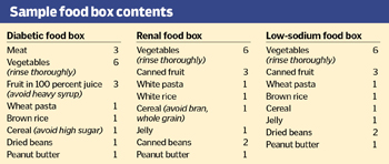 Each box contains about 16 to 18 nonperishable and canned items, including vegetables, fruit, whole wheat pasta, brown rice, cereal, beans and canned chicken. Box contents are modified based on the recipients' dietary restrictions. For example, a box going to a diabetic patient would not include jelly. A box for a person following a low-sodium diet would contain canned products with reduced levels of salt.