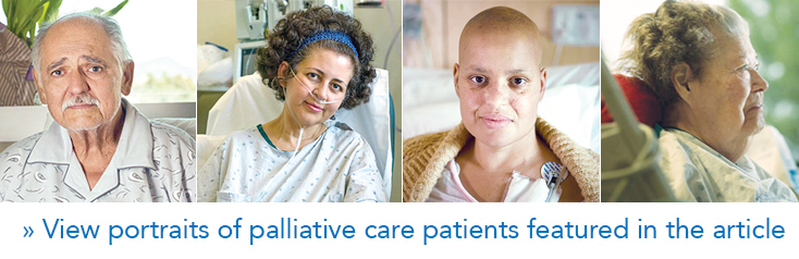 The portraits of 20 palliative care patients, 18 of whom were cared for by Providence Holy Cross Medical Center in the Mission Hills district of Los Angeles, are accompanied by placards with the patient's reflections on the joy and disappointment, accomplishments and challenges that make up a life. Some of the portraits are shown here.