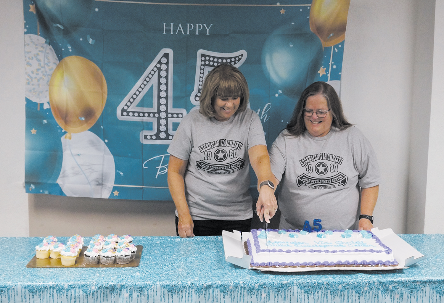 The Child Development Center hosted a birthday celebration this summer, and families and teachers enjoyed looking at photos from the last 45 years, seeing if they could spot familiar baby and child faces — and even younger versions of Wittrig and Swindle.