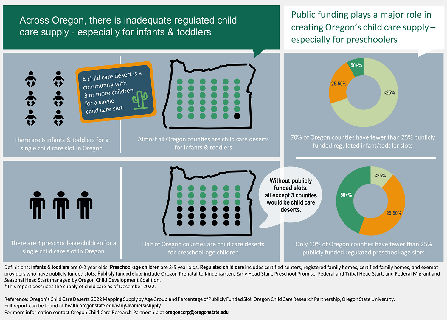 According to a 2022 study by Oregon State University, most Oregon counties are child care deserts for infants and toddlers, and half of the counties in the state are deserts for preschoolers. A child care desert is a county where there is just one licensed child care slot available for every three or more children.
