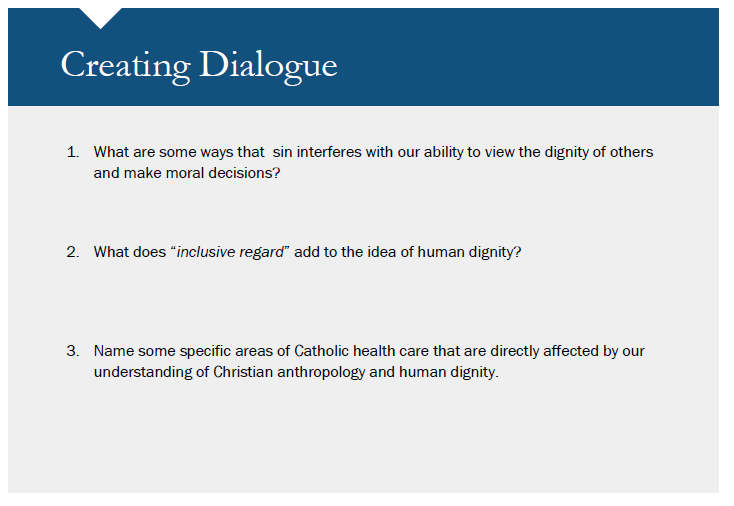 Principles and practices in Catholic health care ethics presuppose the robust theological anthropology of Catholic moral tradition. Ethical analysis of particular issues in health care — for example, reproductive issues — start with Catholic views of the person, but they can also unfold with limited reference to personhood beyond appeals to the first meaning of human dignity, the inherent worth of persons. There is value in grappling with the human person as a creature and agent set within dynamics of sin and grace. I argue that Catholic accounts of human dignity need to reckon better with the perceptual and, therefore, dynamic character of dignity in order to foster more inclusive regard for persons and to sustain critical attention to broader structures have the ability to increase or limit vulnerability.