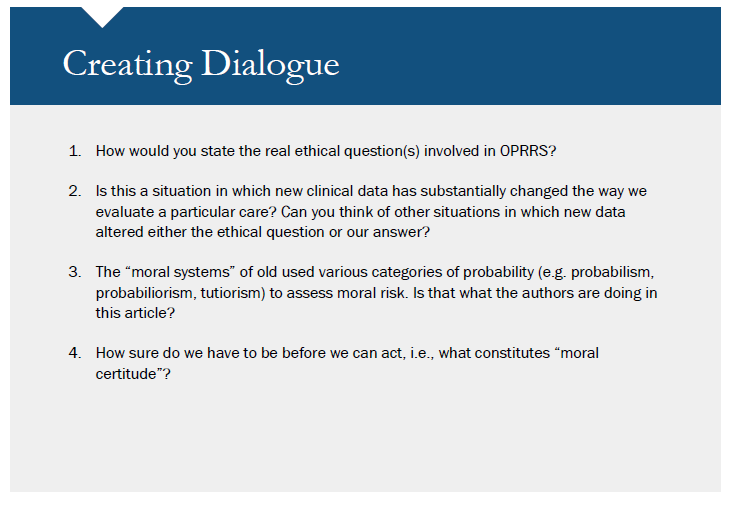 In considering the situation of patients falling into the four categories above, we must disagree with the positions taken by both Gremmels et al., and the NCBC. All those commenting would agree with us that justification for opportunistic salpingectomy can be found for high risk patients, both postmenopausal and premenopausal. Surprisingly, the NCBC statement did not address, nor allow for, the possibility of opportunistic salpingectomy in a postmenopausal, non-fertile patient. As we have shown, the justification and benefit for the procedure in an average risk patient may be low, but the attendant risk would also be low. Therefore, we find no ethical issue that would prohibit this for postmenopausal patients in a Catholic hospital. Our opinion is evidently shared by the Catholic Medical Association, as evidenced by their published resolution.15