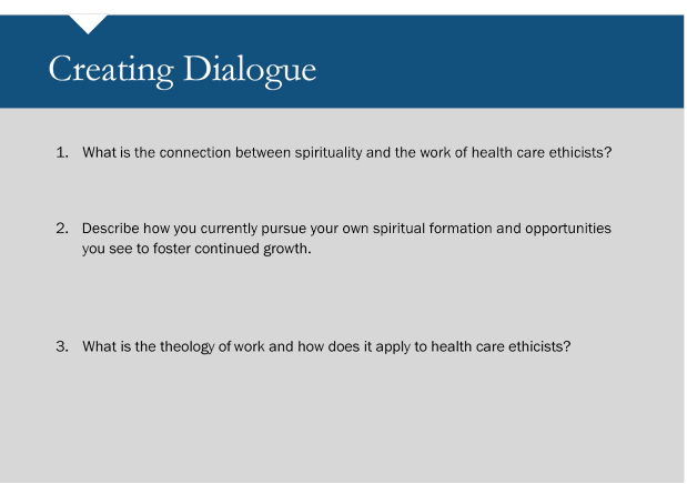 I will explore the deeper meaning and significance of what you do and the relationship between your work and spirituality in four steps. First, I will focus on what might be most meaningful and fulfilling about your work and what might be most challenging. Second, I will offer a theology of spirituality that sees our work and our spiritual lives as intrinsically connected. Third, I will explore a theology of work that offers a vision of work that is an alternative to the current cultural view. Rather than envisioning work to be primarily about career advancement and professional achievements, this alternative vision suggests that your work in health care ethics is better understood as a gift from God that you offer as a gift to others. Fourth, I'll conclude by considering three virtues that might help you grow in your spiritual life through your work.