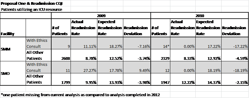 If we compare readmission deviation rates for adult ICU patients who received ethics consultation to all other adult ICU patients, the cohort positive for ethics consultation was favorable in all years 2009-2012. Impact on decreasing ICU readmission rates among patients who received ethics consultation continued from 2009 through 2012 even as the number of patients receiving ethics consultation increased. Finally, of note is the readmissionobs rate for 2010 which came in at 0.00% for the adult ICU patient population who received ethics consultation.