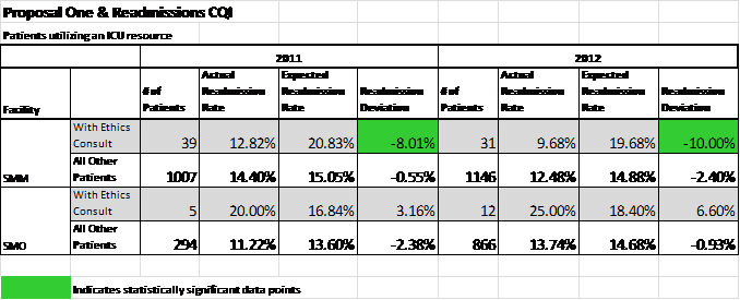 Results: In all years, 2009-2012, readmission deviations were favorable to the risk-adjusted readmissionobs for ICU patients who received ethics consultation. Most notably, readmission deviation in 2011 and 2012 represented a large enough cohort to reach statistical significance (p < 0.001 in green).