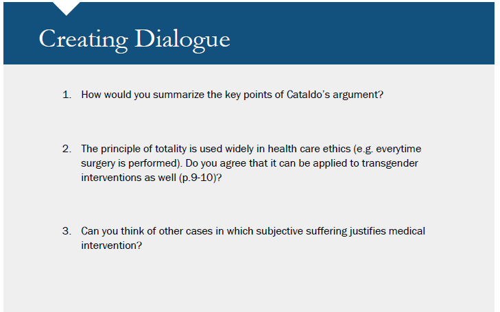 - See, for example, National Catholic Bioethics Center, "Brief Statement on Transgenderism."