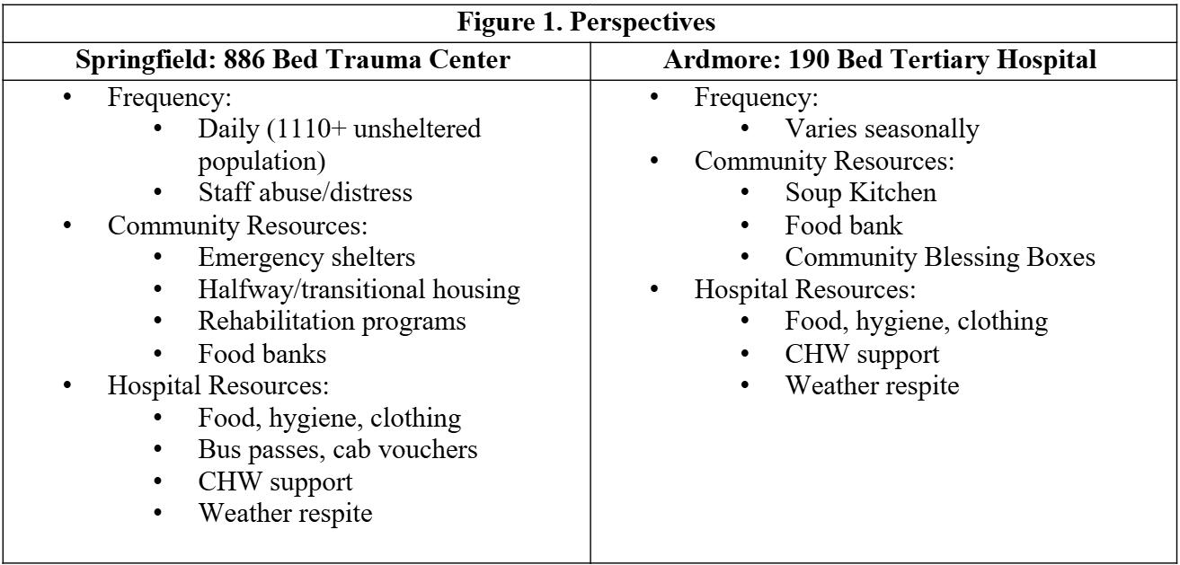 Mercy Hospital Springfield is an 886-bed Level I trauma center in a metropolitan area. Mercy Hospital Ardmore is a 190-bed tertiary hospital and a Level III trauma center in a rural area. Figure 1 shows some of the differences faced by the Mercy Springfield and Ardmore hospitals with regards to the frequency of encountering unsheltered persons and the community and hospital resources available to refer them to.