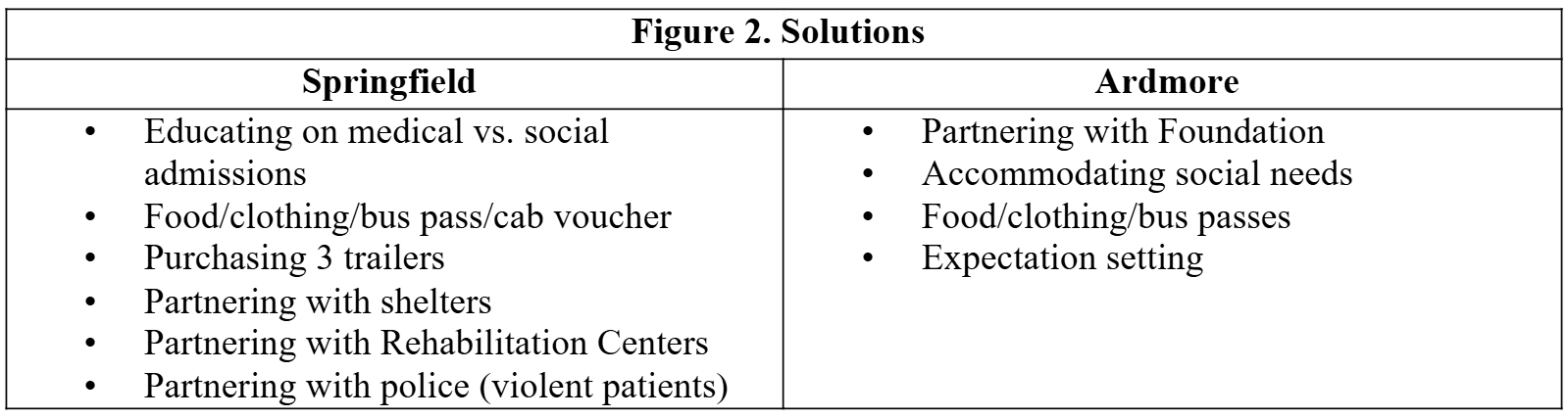 Figure 2 depicts some of the different solutions from collaboration with stakeholders to provide the best care for this patient population. Springfield's solutions centered around involving appropriate partners within the community to support these patients in finding assistance outside of the Emergency Department. Of note, is the partnership with the hospital's Foundation to acquire three trailers at a strategic location within the unsheltered campground supported by a groundskeeper to provide temporary housing for unsheltered patients cleared of acute medical needs without a safe place to discharge. If available, the unsheltered person would receive a cab voucher and a ticket to one of the trailers to spend a night out of the elements with a boxed meal and water. At Ardmore, the Foundation helped with transportation costs through paying for taxis or bus passes.