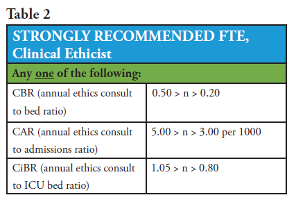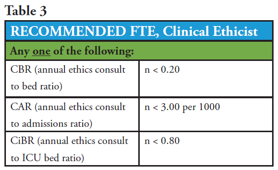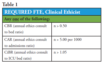 Table 1 sets clinical ethics consultation levels commensurate with that which I believe would require a full-time equivalent in clinical ethics. For example, for a facility within a region that has 200 beds, a CBR of n > 0.50 would represent 100+ clinical ethics consults annually. If a particular facility or region has 25,000 admissions annually, a CAR of n > 5.00 per 1000 would represent 125+ clinical ethics consults. Or if a facility within a region maintains a 50-bed ICU, a CiBR of n > 1.05 represents 52+ clinical ethics consults. These recommendations suggest that where any facility, or a facility within a defined region, meets any one of these thresholds for clinical ethics consultation volume, an FTE in clinical ethics is required. I readily acknowledge that these levels are entirely based on volume, which suggests that prior to the FTE, an ethics committee or some similar body is responding to these volume thresholds. I do not attempt to address the matter of the quality of the clinical ethics consultation in response to the volume, but I would maintain that an FTE in Clinical Ethics is warranted at these significant volume thresholds to ensure high quality clinical ethics consultation consistent with the standards set by the American Society of Bioethics and the Humanities (ASBH)3 and The Catholic Health Association (CHA) in its publication, Striving for Excellence in Ethics.4