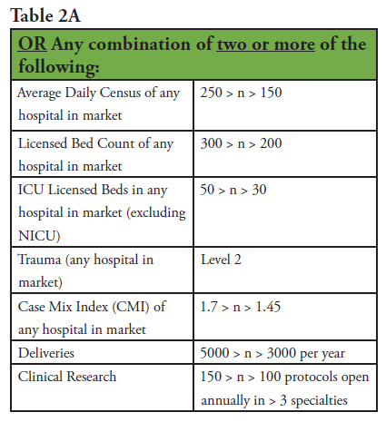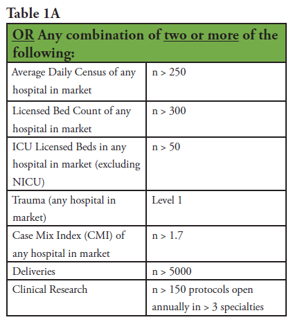 Table 1A also accounts for a combination of criteria that serve as a proxy where clinical ethics consultation volume alone may not warrant a required FTE in clinical ethics. In other words, despite the fact that a facility may be 200+ beds or maintain a 50+ bed ICU, for whatever reason it may not experience a significant volume of clinical ethics consultation.5 In the absence of this volume, the first six criteria suggest that the size of the facility or number and acuity of patients cared for, in my experience, warrants a required FTE in clinical ethics. Gremmels has made a similar argument citing the incidence rates of preeclampsia, premature rupture of membranes, and other causes of induction which often result in complex clinical ethics consultation6 thus establishing a threshold for number of deliveries. He also uses Trauma Levels7 and Case Mix Index8, but does so across differing recommendation levels and thus does not allow for comparison between categories based on similar criteria.