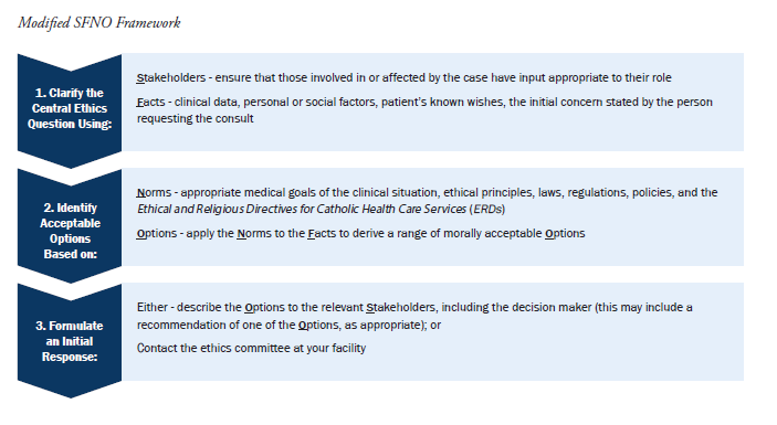 Our Modified SFNO Framework places these four items into a three-step process; the added steps assist with the identification and resolution aspects of ethics consultation. The first step, clarify the central ethics question, narrows the focus of the discussion on the primary issue at hand. Too often, conversations and ethics consults focus on ancillary issues or get stuck down rabbit holes. The central ethics question might change throughout the course of a case as more facts emerge. The second step identifies a range of appropriate options. Casting a wide net and eliminating unacceptable options are helpful here. It is better to reject an option for a specific reason than to leave a potentially acceptable option unnamed. The third step, formulate an initial response, works towards resolution of the ethical issue. It is broad enough to allow the resident to resolve the issue on his/her own, present options to a patient or surrogate decision maker, or seek assistance from the ethics committee. It permits the resident to make a recommendation to the decision maker or to refrain from interfering. We stress with residents to not refrain from requesting an ethics consult. It is perfectly acceptable for them to say, "I don't know" as long as they then call someone who does.