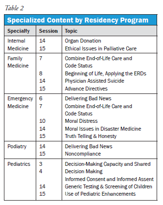 To meet the third goal mentioned above, the sessions are tailored specifically to each program in three ways. First, each specialty receives some sessions unique to its field of medicine. (Table 2) The core curriculum includes two specialty- specific sessions but, for some specialties, we combine or eliminate sessions to make room for others. For example, the Emergency Medicine curriculum combines End-of-Life Care and Code Status into one session to make room for a session on Delivering Bad News. Second, the cases for each session are chosen specifically for each specialty. For example, while all specialties receive the same content for informed consent, cases for internal medicine are different from those in emergency medicine. Third, since our residency programs span two states, sessions discuss state-specific laws where relevant such as those regarding advance directives.
