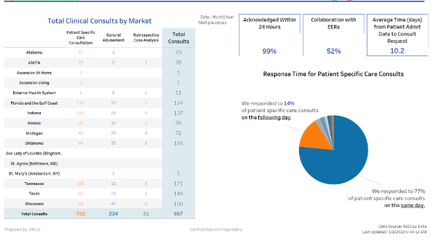 These data allow us to better understand the demand for different types of clinical ethics consultations (e.g., patient specific care consults versus general advisements and retrospective case analyses). The other metrics related to response time, collaboration with Embedded Ethics Resource and "average time (days) from patient admit to consult request" are indicative of whether Ascension's clinical ethics consultation service delivery model is working in moving consult requests upstream and allow us to identify opportunities for continuous quality improvement.