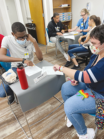 Project SEARCH-Bon Secours St. Francis program interns Marques Hughey, left, and Caitlin Kelly, right, take part in a team-building activity to learn what they have in common with each other.