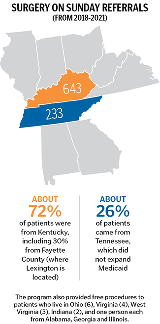 Currently, roughly 30% of Surgery on Sunday's patients speak little or no English. While the majority of patients come from Kentucky, in recent years, roughly 30% have come from Tennessee — an influx stemming from the state's decision not to expand Medicaid access under the Affordable Care Act,2 while Kentucky did.