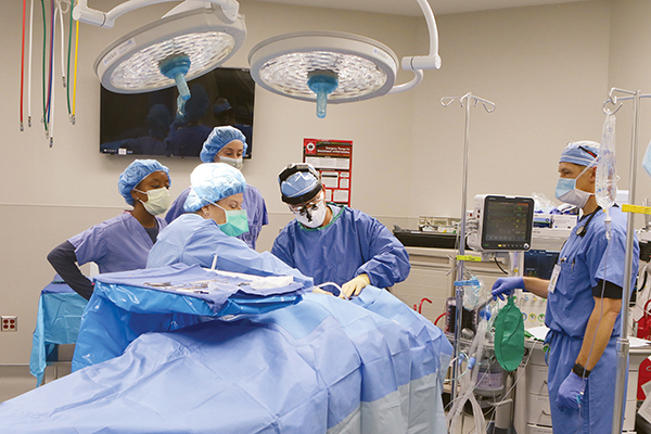 Surgery on Sunday volunteers remove a submandibular neck mass from a female patient. Shown left to right are Corey Lindsay, SRNA; scrub nurse Rebecca Roberts (reaching over patient); Francesca Spirito, SRNA; otolaryngologist Dr. Tad Hughes; and Daryl Bauer, CRNA. Hughes is a Surgery on Sunday board member.