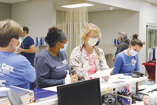 Nurses in Surgery on Sunday's Post Anesthesia Care Unit discuss and assign patients coming out of the operating room for recovery. From left to right, Babs Ernest, RN; Charmayne Brown, RN; Holly Moore, RN; and Mary Todd, RN.