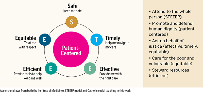 Upon deeper reflection on this framework, we began to see its inherent ties to Catholic social teaching. Through STEEEP, we attend to the whole person and put the patient at the center of all we do as a way to promote and defend human dignity. When we ensure our care is effective, timely and equitable, we act on behalf of justice. As we find ways to make care more efficient, we become better stewards of our resources. And when we provide equitable care, we fulfill our mission to provide care to all, especially for those who are poor and vulnerable. In these ways and more, Catholic health care's identity inspires and drives our resolute commitment to quality care.