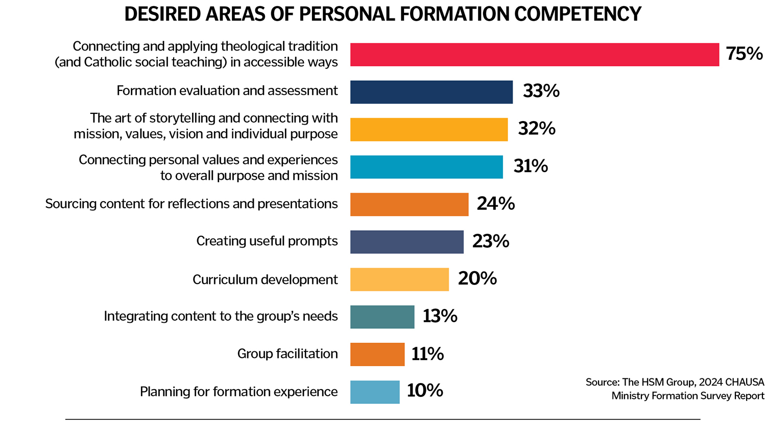 We wanted greater understanding of the aspects of formation where individual leaders desired to grow. CHA has long articulated formation as a core competency of excellence in mission leadership. CHA's 2022 Mission Leader Survey found that overall, mission leaders ranked formation as their top area for growth. In this current survey, the tool offered more than a dozen skills or areas for potential individual growth related to formation (see graph below). Respondents were asked to rank three. Three quarters (75%) cite connecting with and applying the theological tradition (including the Catholic social tradition) in accessible and relevant ways as the overwhelming areas where leaders would like to grow. As many as 3 in 4 respondents picked this as one of their top three needs.