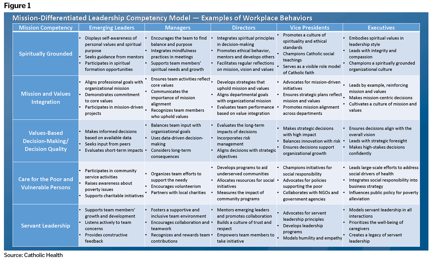 This innovative model equips a mission-differentiated leader in Catholic health care to embrace and manage the paradoxes and complexities of business and mission, as well as the balance between margin and mission. It tailors specific competencies and behavioral expectations to career ladders or leadership stages. It is designed to drive the organization's sacred purpose, vision, mission and values, and we believe it has the potential to shape the future of Catholic health care.