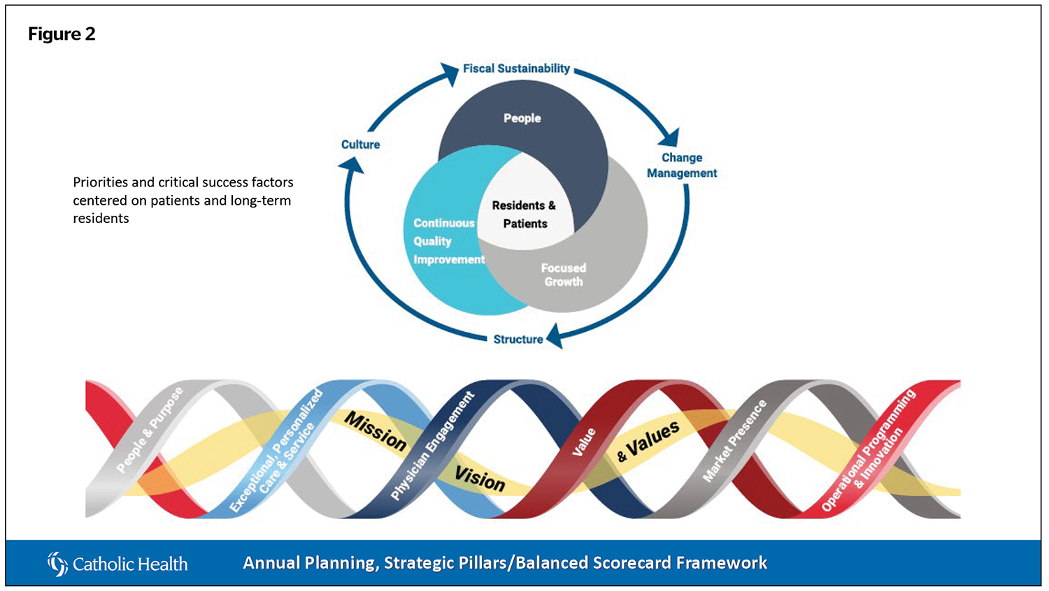 Annual planning, integration and balanced scorecard: Rather than treating mission as an add-on or as a parallel track to operations and business, both mission and business aspects are embedded like a ribbon, woven together and integrated, serving as the core of our six strategic pillars (see Figure 2 above): people and purpose, exceptional personalized care and service, physician engagement, value, market presence, and operational programming and innovation.