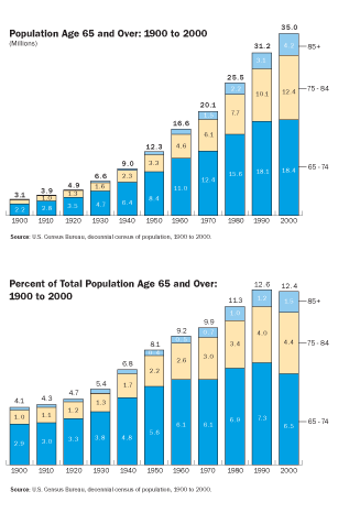 The growth rate of the elderly population far exceeded the growth rate of the total population during the 20th century, according to the U.S. Census Bureau. While the total population more than tripled, the 65 years and older population grew more than tenfold. Strangely, from 1990 to 2000, for the first time in the history of the census, the 65 years old and above population grew slower than the total population. This was directly related to the low fertility rate of the late 1920s and 1930s. The growth of the aged 85 years and older for the century is particularly notable from 122,000 in 1900 to 4.2 million in 2000. The aged 85 and older group increased as a proportion of the elderly population, from 4 percent in 1900 to 12 percent in 2000. In the 1990s, the 85 and older group increased by 38 percent, significantly higher than the 65-to-74-year old group (less than 2 percent), and the 75-to-84-year old group, 23 percent.