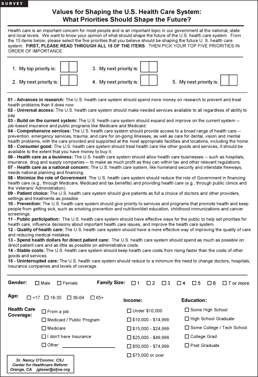Next, I suggest readers develop a "Vision of U.S. Health Care" that can be affirmed by Catholic health ministry across the country. Although the vision will not be cast in Catholic language, it will flow from our spiritual heritage. I have elsewhere criticized our continued use of the "cover the uninsured" slogan, characterizing it as "a flawed moral frame."2 Our ministry needs a crisp but substantial substitute for this misleading moral frame, one that can guide further necessary work. A one-page vision could serve that purpose.