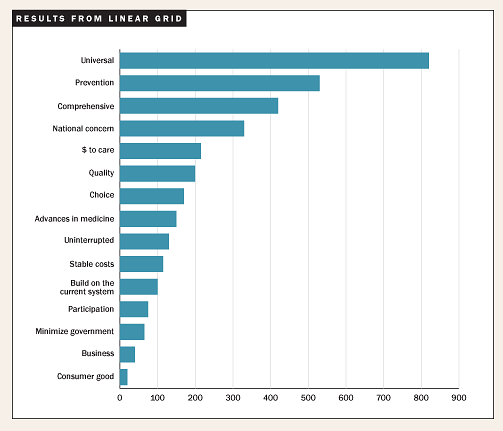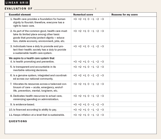 Using the linear grid and the spider graph, compare Medicare, Medicaid and job-based insurance. One could first do this as an individual. Then, as participants in a group, they could listen to one another's judgments and rationales. As a group, they could develop a consensual graph — one that all participants can live with. Finally,they could take time to formulate the insights, drawn from this exercise, which can be applied to the longer-term process of health care reform.