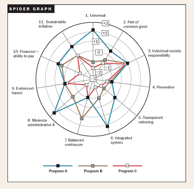 The second possibility offered by the tools is this: They can enable us to make basic and rough ethical analyses and comparative judgments among the many health care proposals currently emerging at the state and federal levels. As primitive as they are, the linear grid and the spider graph allow us, as individuals and groups, to plot multi-level judgments about the various proposals' comparative moral strengths and weaknesses. As a result, even if we choose to support a substantially flawed, short-term solution (for example, SCHIP), the tools can make us more aware of both the specific nature of the compromises involved and the longer-term destination to which justice ultimately calls us.