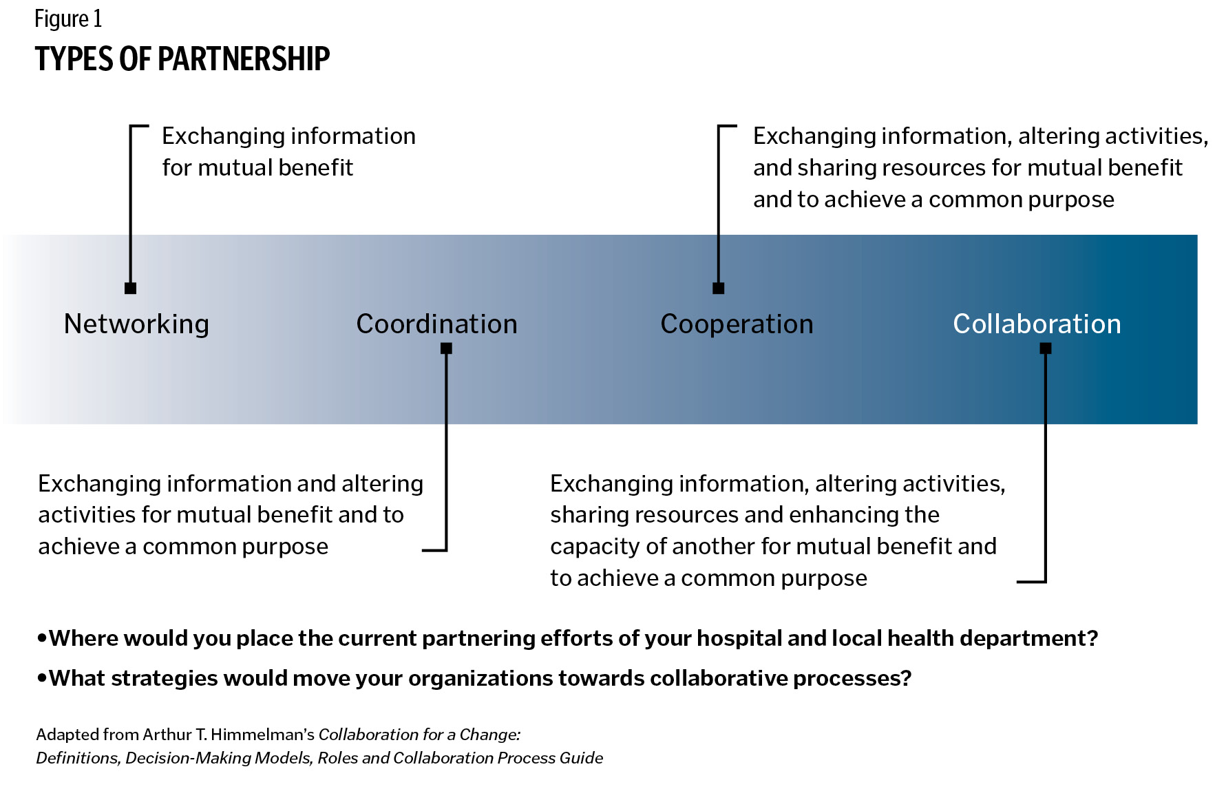 Partnerships between hospitals and local health departments have proven productive in many communities. Better organized systems of care can assure that both treatment and prevention are artful and evidence-based. Designed attention to the unique goals, roles and needs of hospitals and local health departments will benefit from the strengths and assets each partner offers. Communication and dialogue among hospitals, health departments and other local partners can lead to concurrence and a prioritization based on the community's risks to health and remedies to prevent disease. Other benefits include a shared understanding of problems, transparency about efforts to improve health and treat illness and better public support for each partner and the partnership.