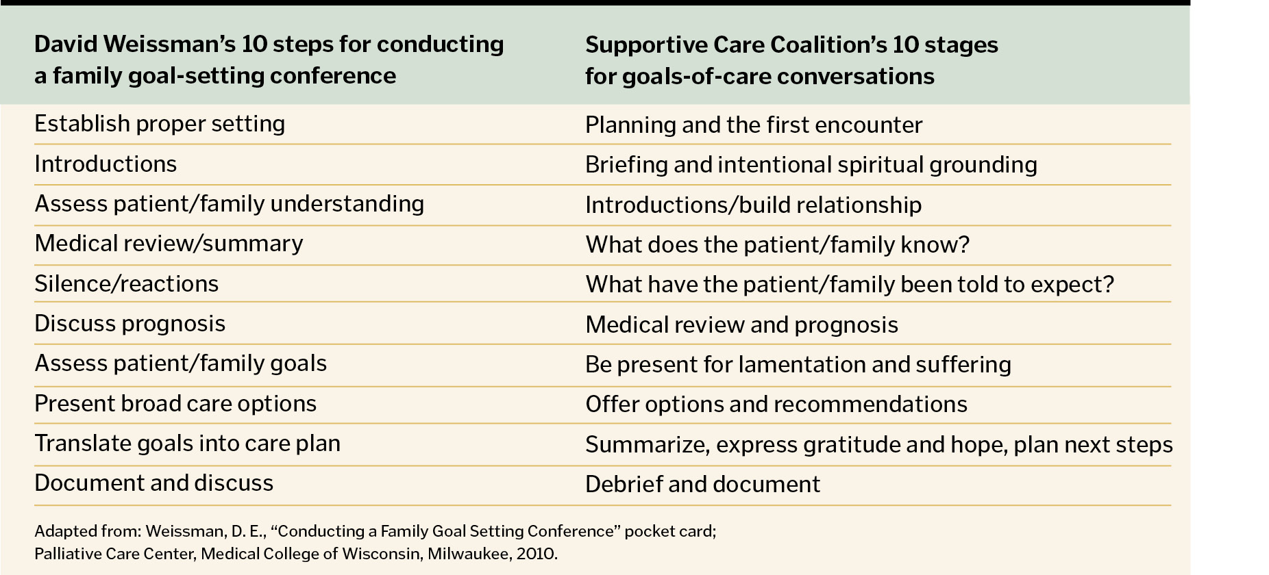 Our "Spirituality in Goals-of-Care Conversations" project's starting point is the 10-step guide for conducting goals-of-care conferences devised by David Weissman, MD.2 (See sidebar). With his permission, we have modified his methodology to place greater emphasis on preparing both the care team and the patient and family for this conversation, identifying sources of hope and spiritual strength, as well as attending to spiritual suffering, loneliness and fear.