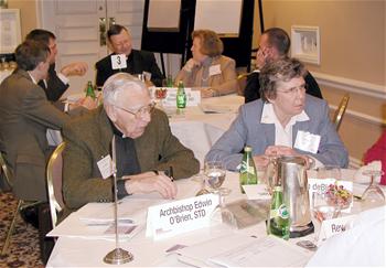 Fr. Albert S. Moraczewski, OP, PhD, president emeritus, The National Catholic Bioethics Center, and Sr. Carol Keehan, DC, CHA president and chief executive officer, participate in a table discussion at the 2006 CHA-sponsored "Dialogue on Medically Administered Nutrition and Hydration."