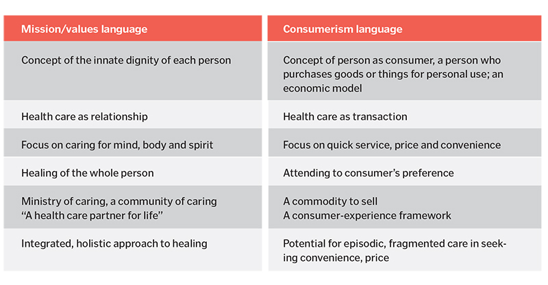 If we believe that language shapes and expresses our values, attitudes and behaviors, individually and collectively, we must engage the challenge that the language of consumerism presents. Through our reflection and thoughtful actions, we can be countercultural, perhaps even influence the broader culture. In all we do, we will maintain that health care, at its core, is a human encounter, a trust relationship, and not simply a transaction based on convenience and price.