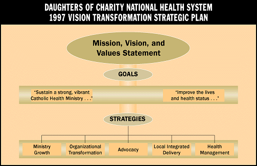 The Daughters of Charity National Health System (DCNHS) has been working to create "a future worthy of our past." In 1997, the system developed its "VISION transformation Strategic Plan," a road map for the challenging future. Building effective integrated delivery networks is integral to the achievement of DCNHS's overarching goals (see Figure).