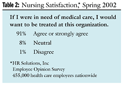 A close look at one question on the satisfaction survey reveals all one needs to know about why there is a nursing shortage. To the statement, "If I was in need of medical care, I would want to be treated at this organization," 91 percent of St. Marys' nurses responded "Agree" or "Strongly agree." Of the remainder, 8 percent were neutral and 1 percent disagreed (Table 2). Contrast this response with an American Nurses Association survey whose results were reported in 2001.1 In it, nearly 7,200 nurses were asked: "Would you feel confident having someone close to you receive care in the facility where you work?" Only 51 percent of nurses responded "yes," while 41.5 percent said "no." In far too many settings, our nation has created unworkable practice environments in which nurses do not believe they can deliver appropriate care.
