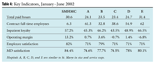 A reputation for excellence, a practice environment that is managed by the clinical practitioners, and a collegial relationship between management and staff have resulted in a turnover rate for nurses that is less than half of the national average, which in 2000 was more than 20 percent.2 Whereas the national vacancy rate for nurses is more than 10 percent, St. Marys' rate is about 3 percent. Meanwhile, St. Marys' operating margin is consistently far above national averages (Table 4).