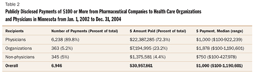 State disclosure data on industry gifts/payments to physicians also shed some light on this now ubiquitous practice. Joseph Ross and colleagues reported in the March 2007 issue of Journal of the American Medical Association on their efforts to assess the prevalence and magnitude of disclosed payments of $100 or more from industry to physicians in Vermont and Minnesota.11 Looking at the Minnesota data, which are particularly helpful because the law makes all disclosed data part of the public record, Ross and colleagues found that from Jan. 1, 2002, through Dec. 31, 2004, pharmaceutical companies issued 6,238 payments of $100 or more to Minnesota physicians totaling more than $22 million, with payments ranging from $100 to $922,239 (see Table 2). The majority of these payments were for an unspecified purpose (2,840, or 45.5 percent), followed by payments for education (1,659, or 26.6 percent), speaker honoraria (818, or 13.1 percent) and service on an advisory board (309, or 5 percent) [see Table 3].